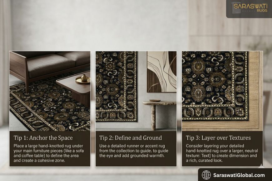 Understanding why hand knotted rugs are so valuable is important before getting into styling tips. Each rug is made one knot at a time by skilled artists, giving each one a unique look and making it last a long time.